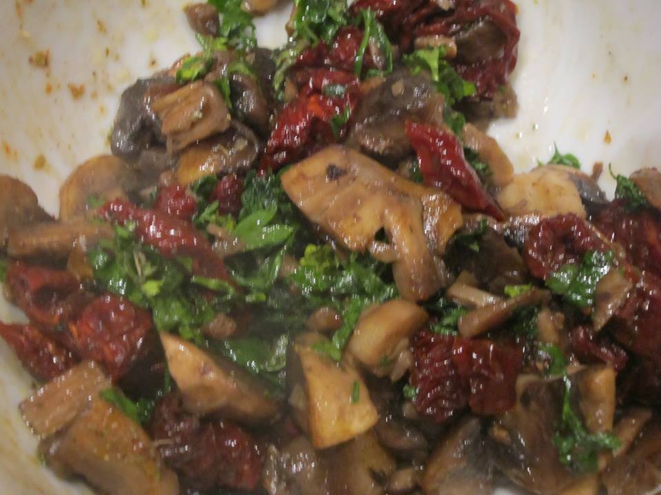 Keverjük össze a gombát, az aprított petrezselymet és a darabokra vágott aszalt paradicsomot.