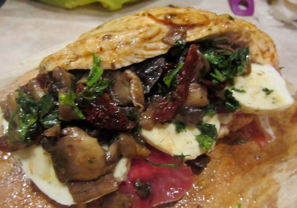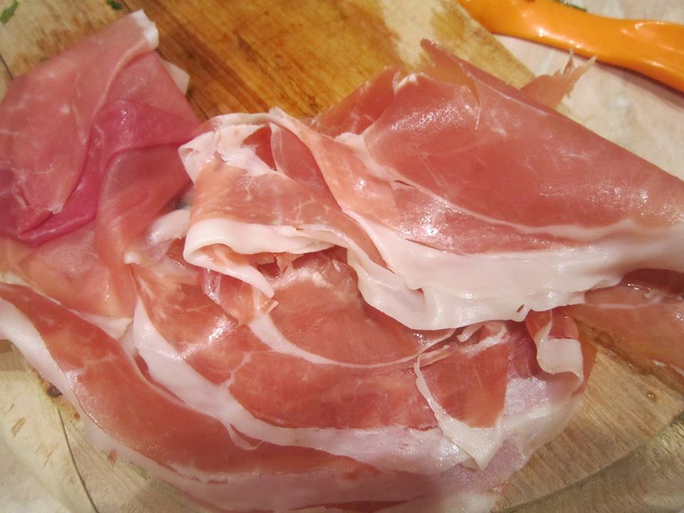Tegyünk egy-egy szelet prosciutto-t a zsebbe, rakjunk rá mozarella-karikákat, majd jól tömjük meg a gombás töltelékkel.