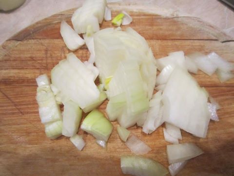 a hagymát kockára vágjuk, olajon megfonnyasztjuk.
