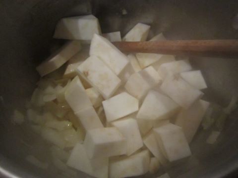 Közben megpucoljuk és kockákra vágjuk a zellert és a burgonyát, rádobjuk ezeket a hagymára és további egy percig pirítjuk.