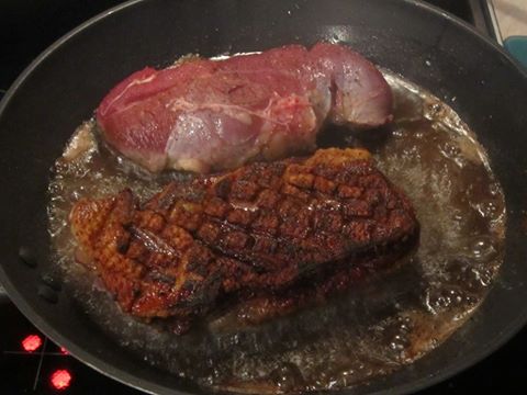 Hevítsünk fel egy serpenyőt, és fektessük bele a kacsamelleket a boros felükkel lefelé. Addig süssük, amíg minden zsír ki nem sül belőle, ezt időnként ellenőrizzük, és ha túl sok zsír lenne a serpenyőben, azt merjük le róla.