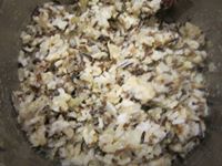 Tegyük a vadrizst egy lábosba és 1 1/2 csésze húslevessel forraljuk fel. Csökkentsük a hőt, fedjük le és pároljuk 45-50 percig. Ha elkészült, csepegtessük le és tegyük egy tálba hűlni.
